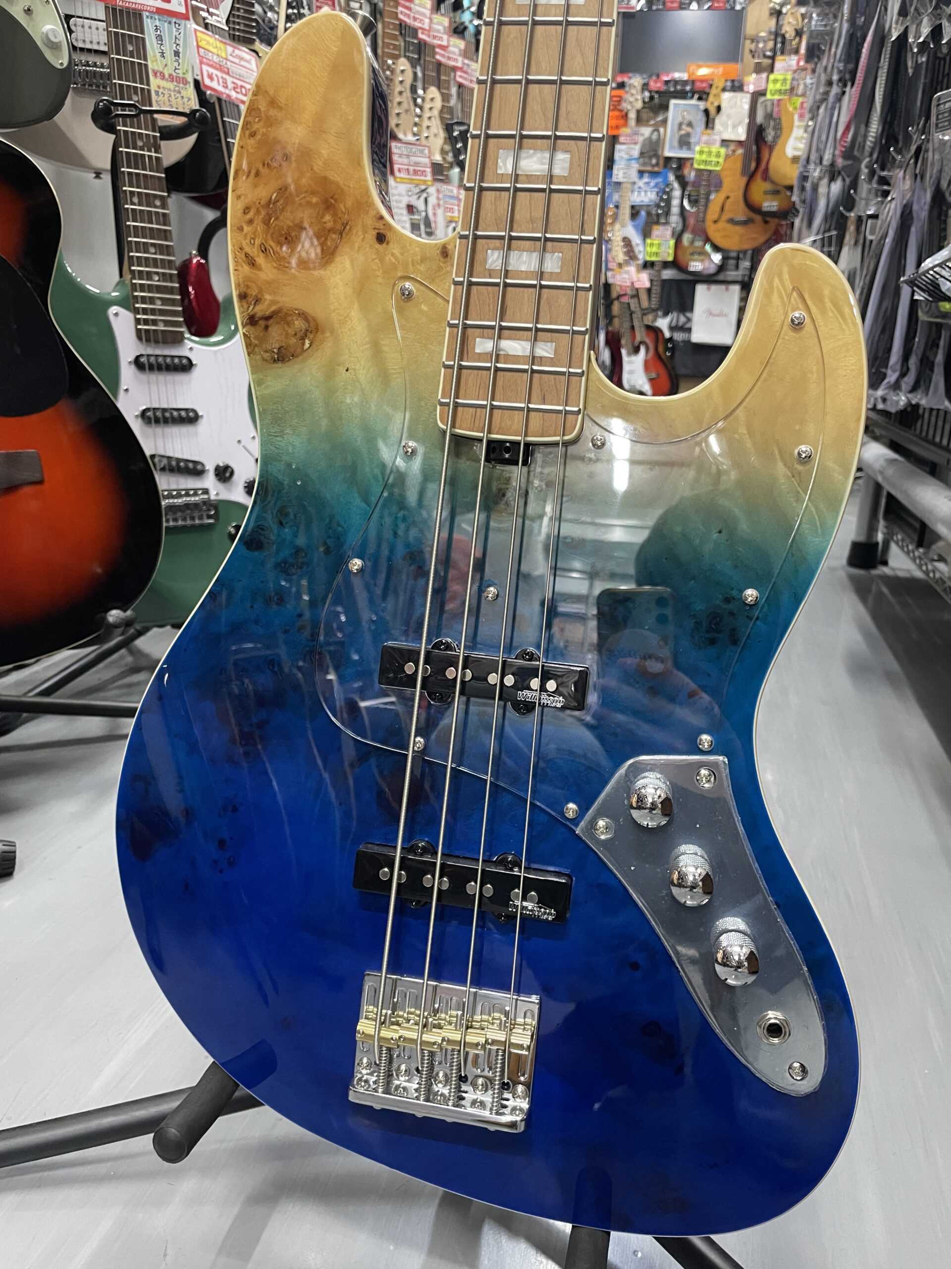 バールポプラトップを採用したJBスタイル「SJB-800」は、美しい木目を引き立てるカラーリングに加え、ローステッド・メイプルネックやネックバインディング、ブロックポジションマークによる高級感あふれるルックスが特長です。ピックアップやブリッジには信頼のWilkinson製パーツを搭載し、外観だけでなくサウンドや演奏性にもこだわりました。さらに、ネックジョイント部にはヒールレスカットを施すことで、ハイポジションでのプレイアビリティも大幅に向上しています。